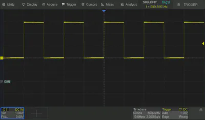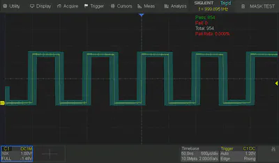 サンプリングレートとメモリ長は画像右下の Timebase 欄にある通り、サンプリングレート 10MSa/s, メモリ長 10Mpts です。しかし仕様上、2 チャンネル使用時は 1 GSa/s、25 Mpts なので、1 秒間の測定時には 25MSa/s のサンプリングレートが得られるはずです。