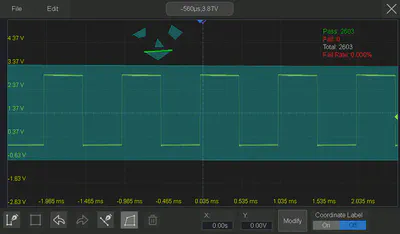方形波がプローブの校正用端子から出ているので、測定してみます。タッチパネルの追従性もよく、各調整つまみもラグ無く操作できました。