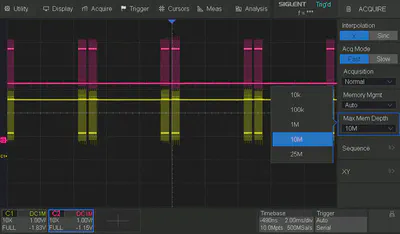 実はデフォルトでメモリ長が 10 Mpts に設定されていました。波形更新レートを優先しているのだと思われます。ここで変更できます。