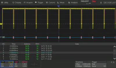 デコード結果です。送信先アドレス、データ、スレーブからの ACK 信号が確認できます。