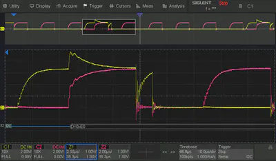 続いて、波形の一部を 1 万倍拡大したものです。画面全体で約 100 マイクロ秒の範囲を表示しています(10 µs/div)。